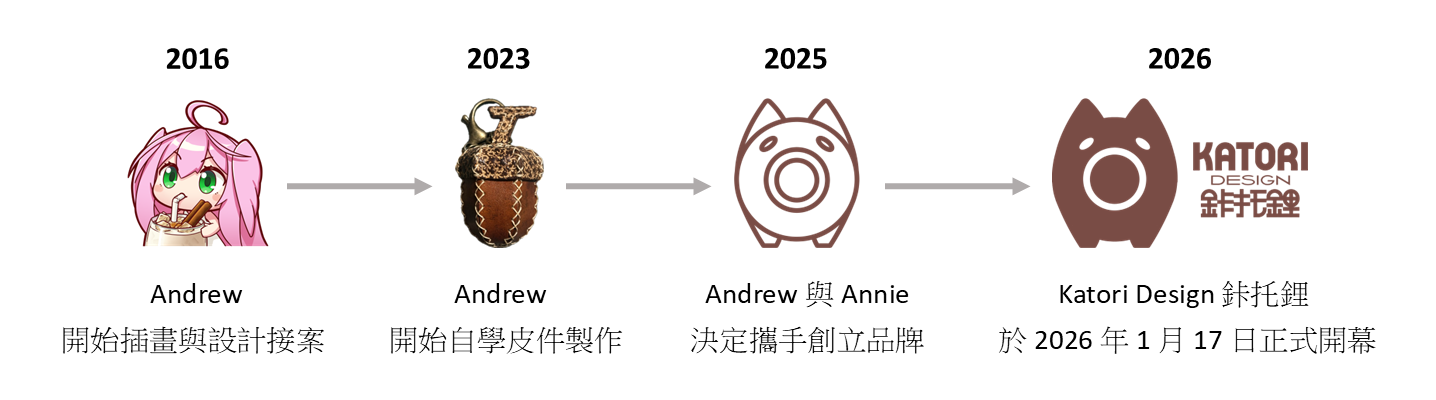 Katori Design 是一個結合插畫、周邊設計、遊戲美術、插畫應用商品,以及手工皮件的設計品牌,由一對兄妹 Andrew 與 Annie 共同創立。哥哥 Andrew 擔任設計師,負責插畫、視覺開發,以及皮件設計與製作;妹妹 Annie 則負責營運規劃、品牌整合與內容推廣。